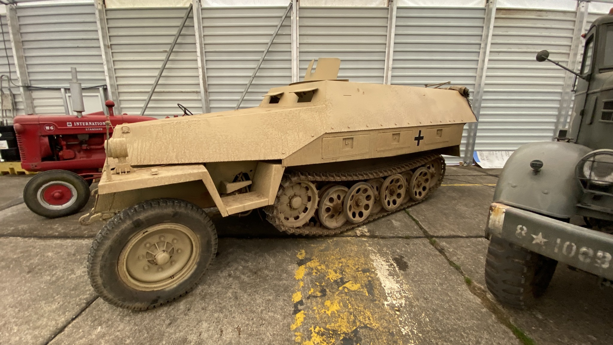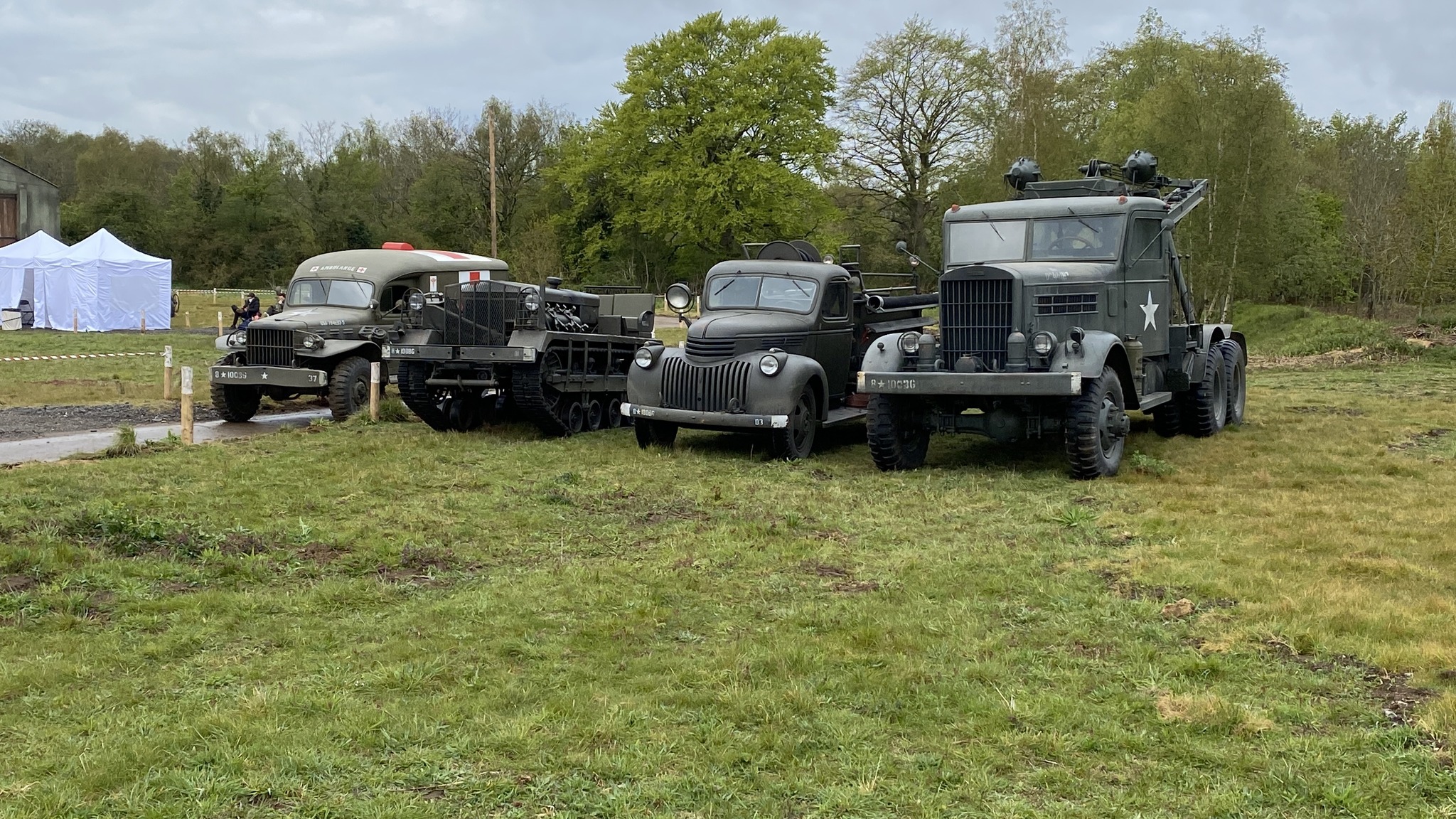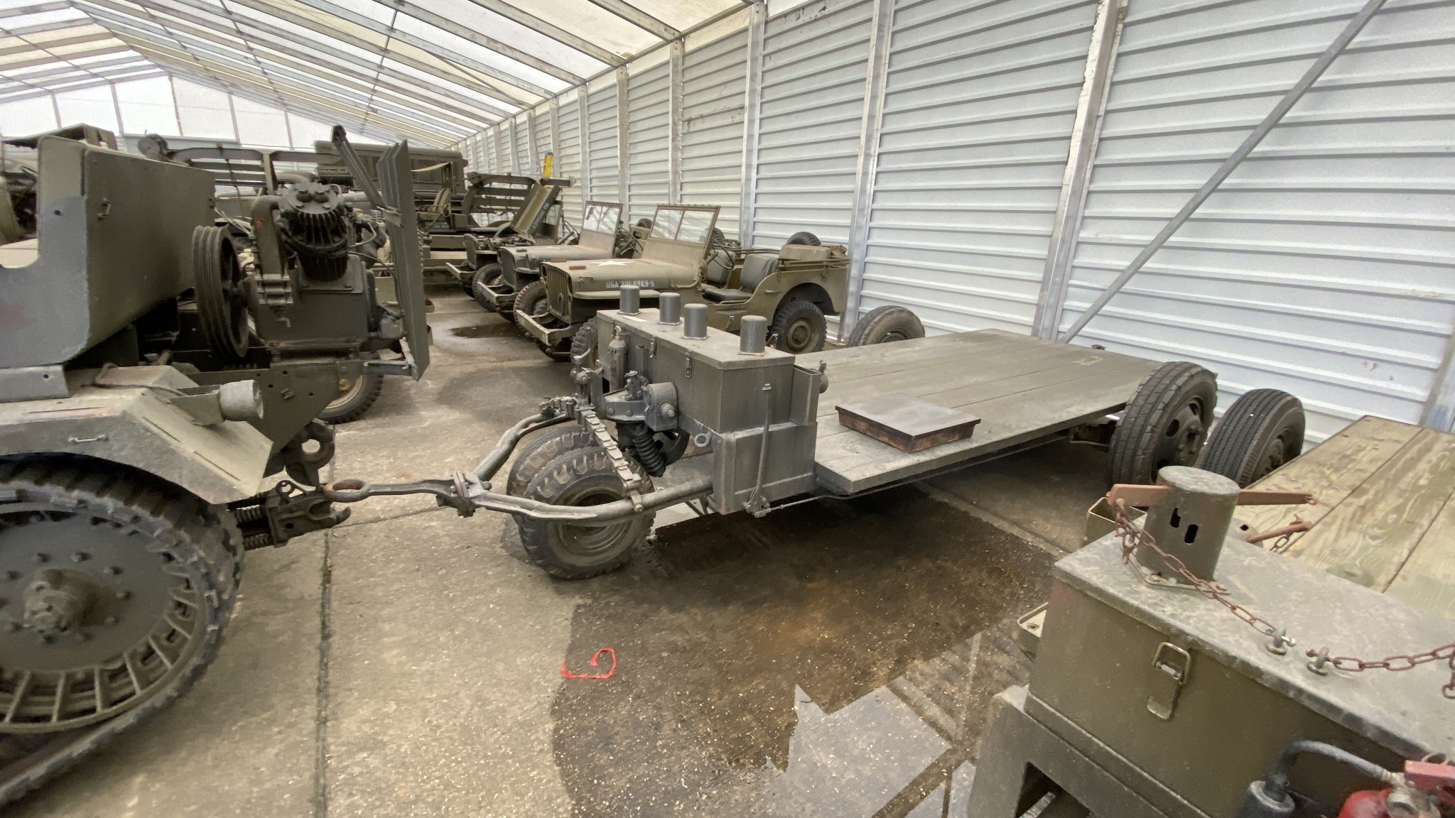 The Cletrac M-2 tractor. These were used for towing and servicing the bombers and fighters. These 15,000 pound tractors were also fast so they could get around the airfield in a hurry. They carried air compressors to make 2000 PSI air for servicing struts and regulated down for tires and tools. They had a generator making 115 volts DC for power tools and lighting. I think Ian had three Cletracs on set.