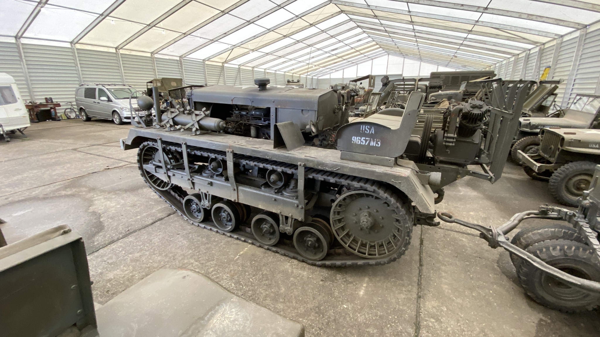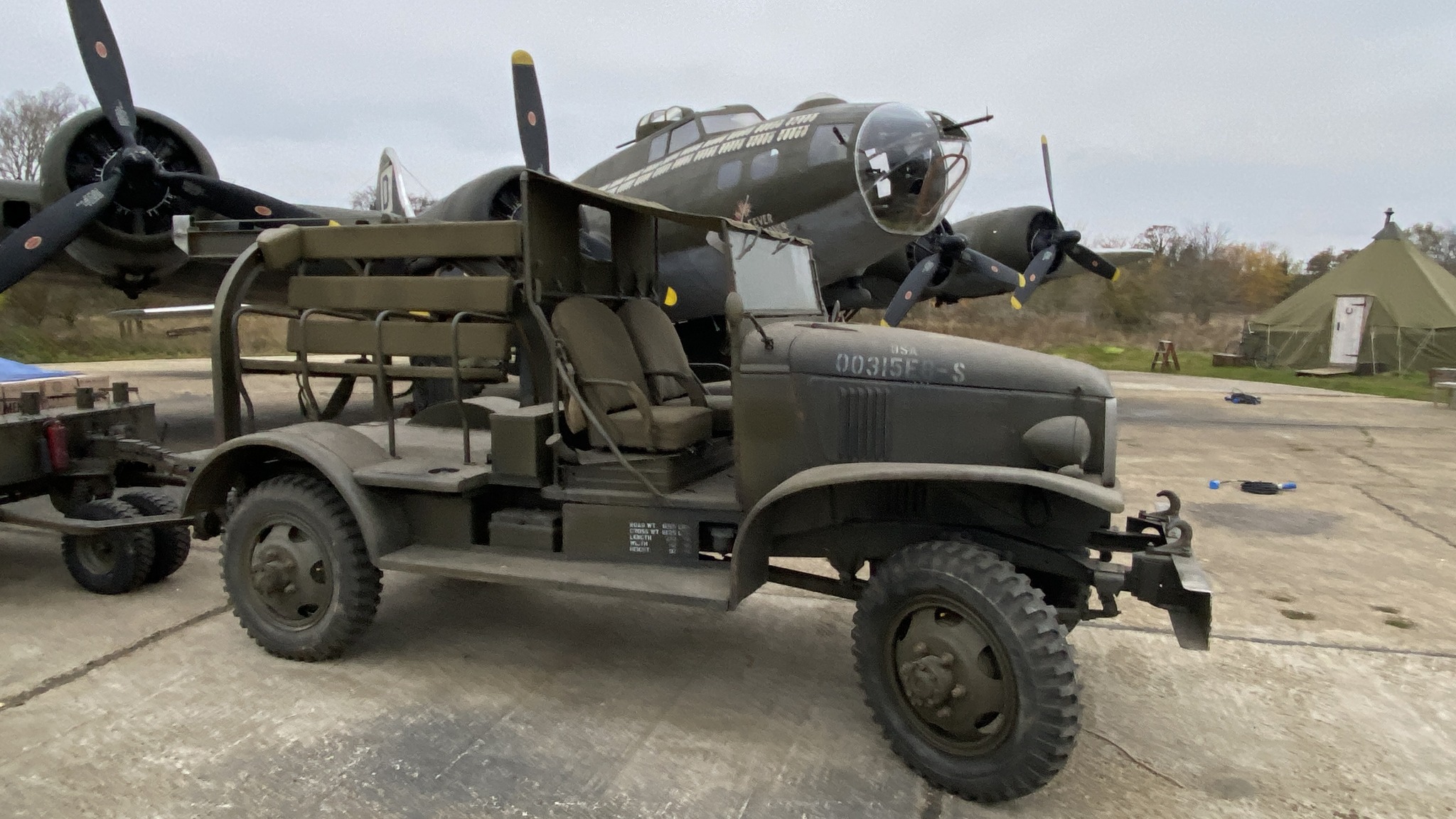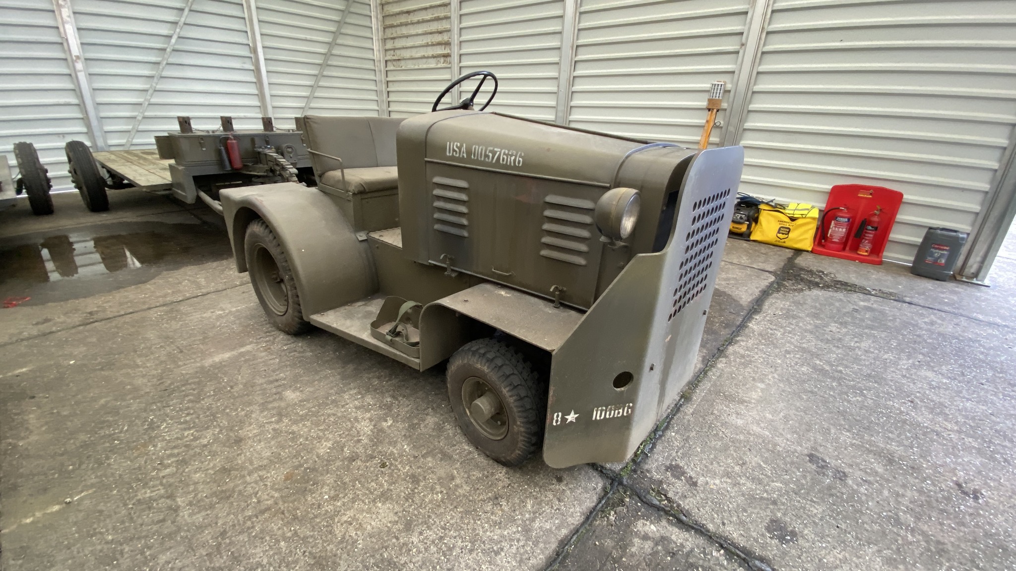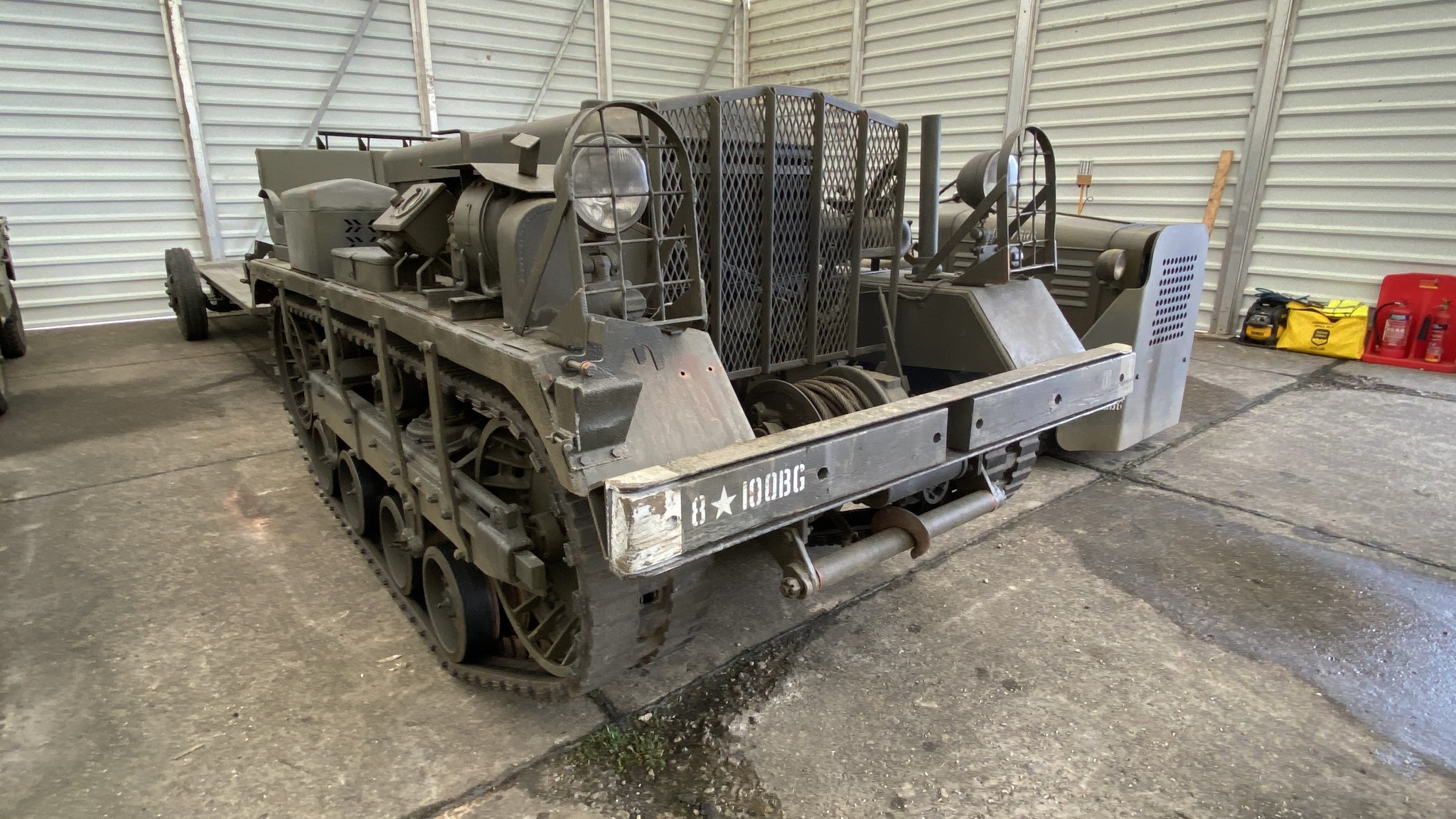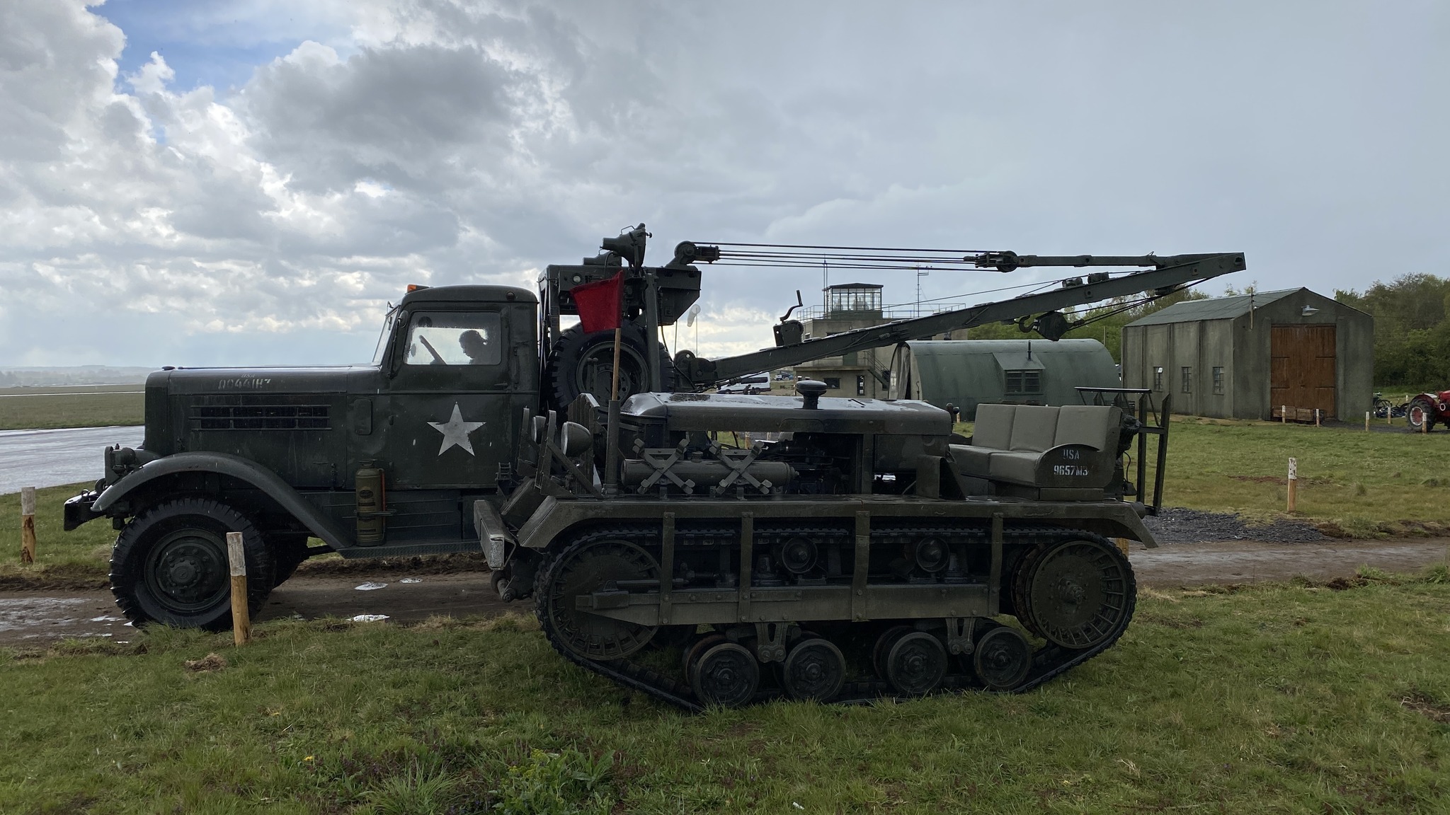 The Cletrac M-2 tractor. These were used for towing and servicing the bombers and fighters. These 15,000 pound tractors were also fast so they could get around the airfield in a hurry. They carried air compressors to make 2000 PSI air for servicing struts and regulated down for tires and tools. They had a generator making 115 volts DC for power tools and lighting. I think Ian had three Cletracs on set.