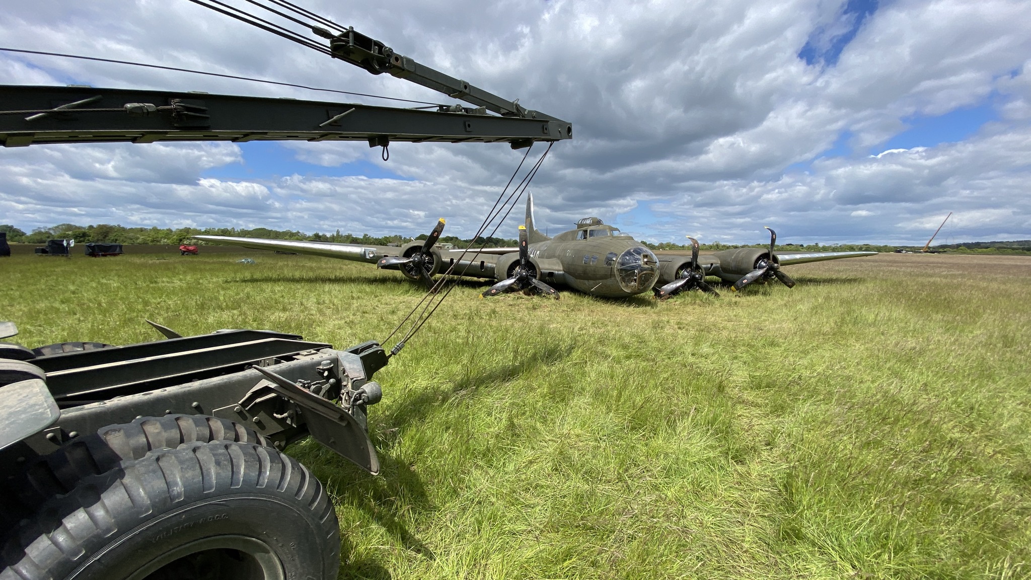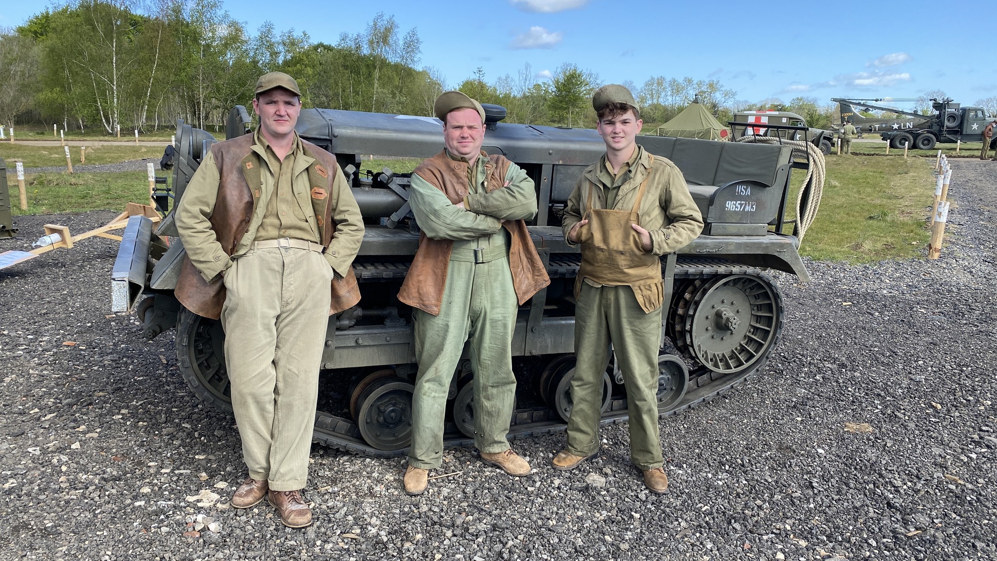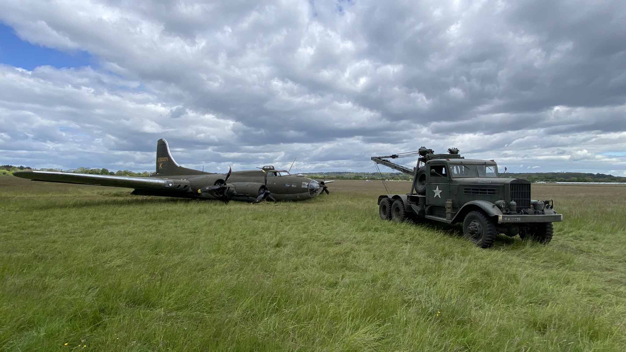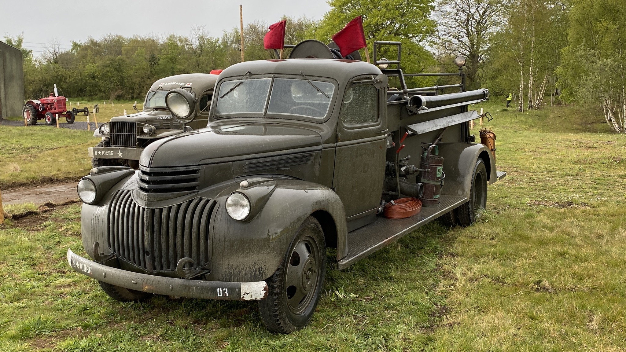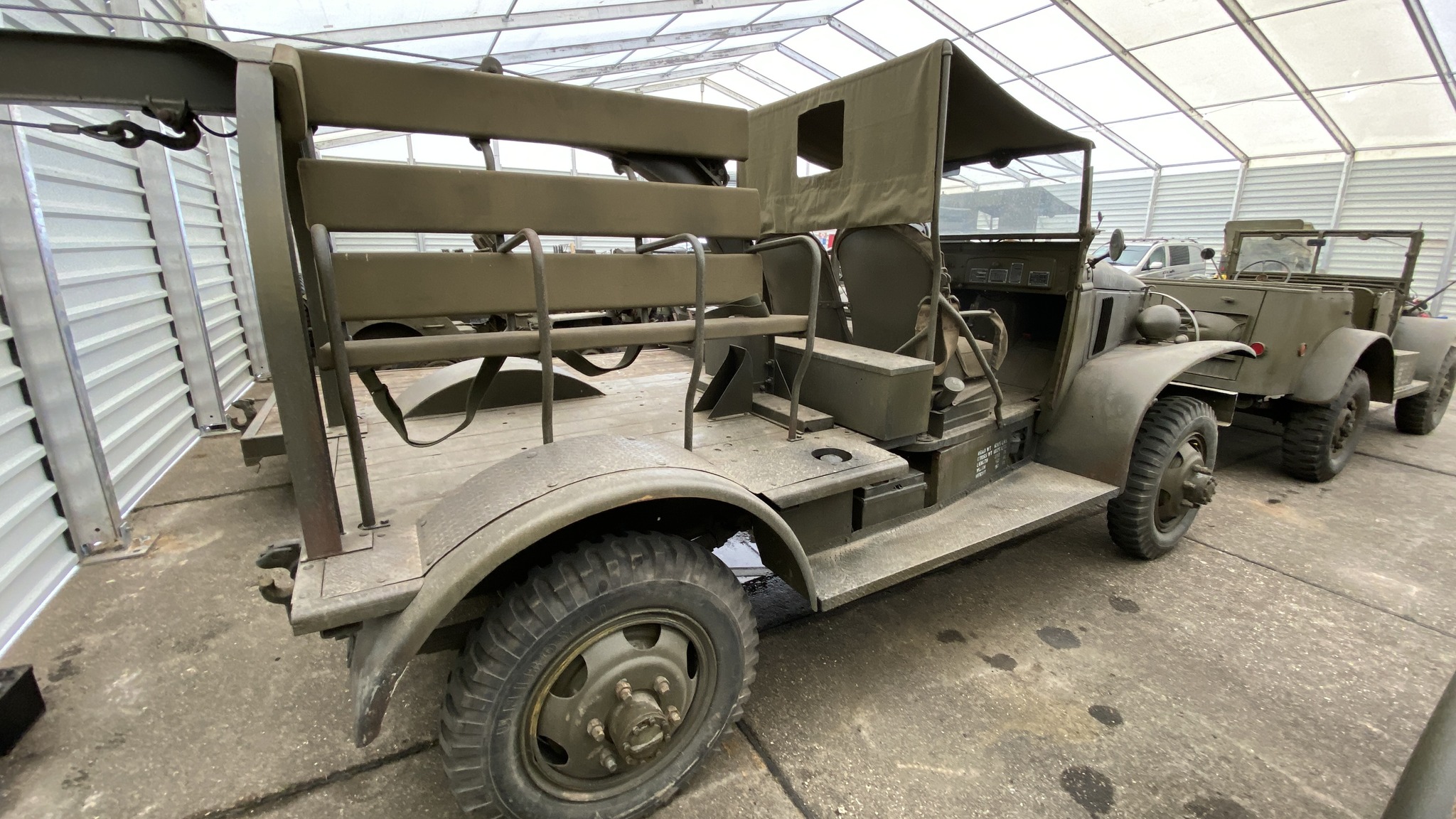 The Cletrac M-2 tractor. These were used for towing and servicing the bombers and fighters. These 15,000 pound tractors were also fast so they could get around the airfield in a hurry. They carried air compressors to make 2000 PSI air for servicing struts and regulated down for tires and tools. They had a generator making 115 volts DC for power tools and lighting. I think Ian had three Cletracs on set.